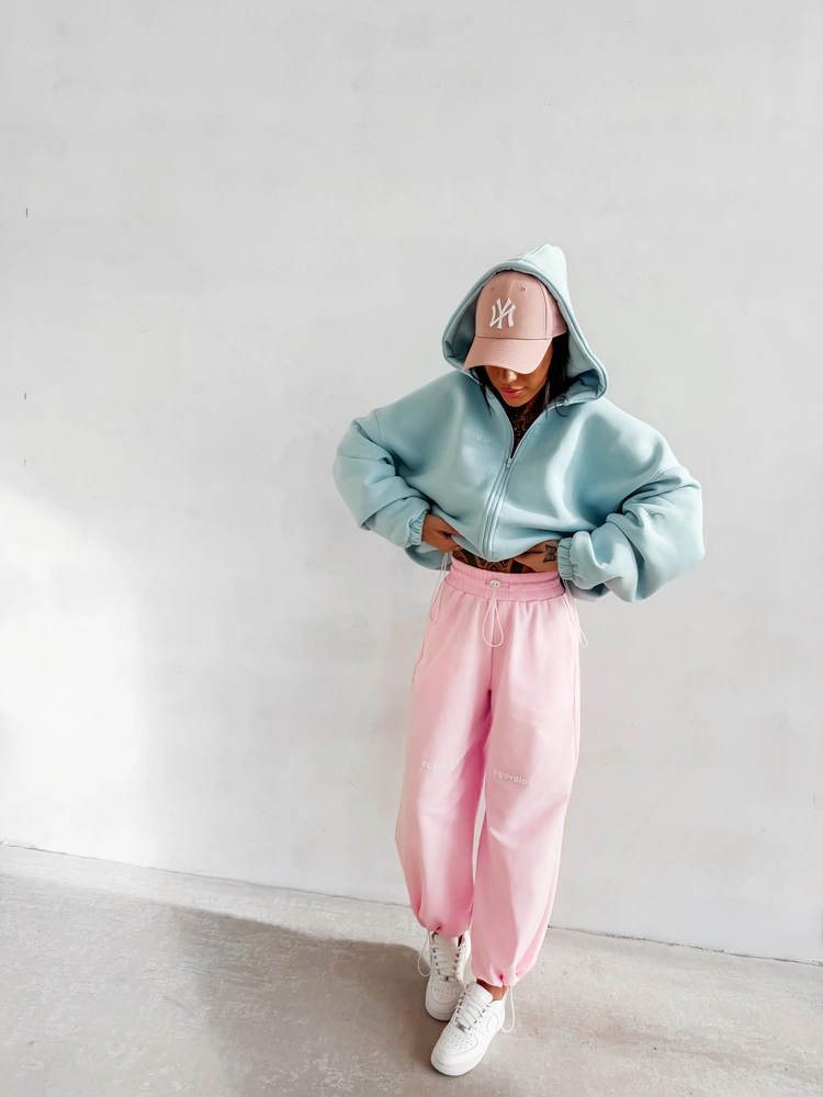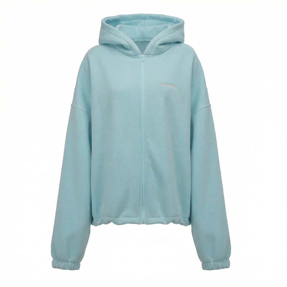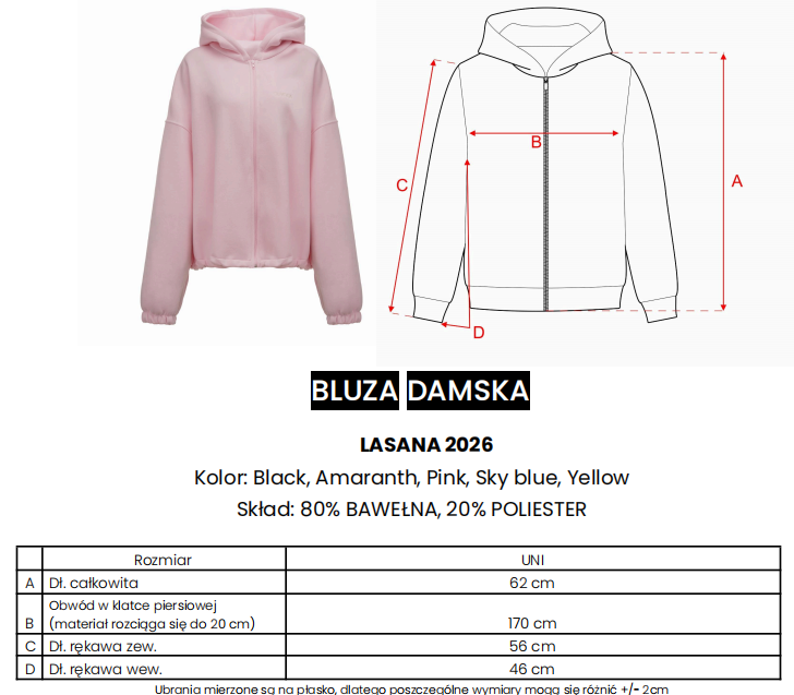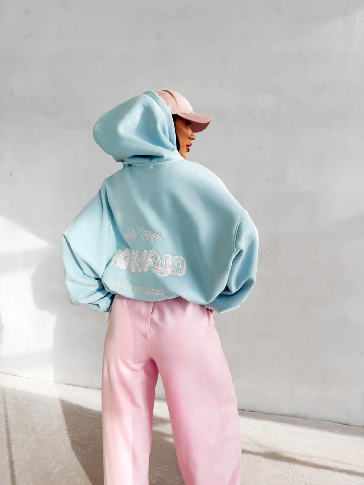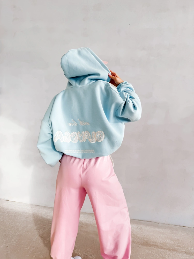 Ważne aspekty: luźny, komfortowy krój oversize, kaptur, zapięcie na suwak, miękka dzianina premium, haftowana aplikacja „with love OLAVOGA” na plecach, subtelne logo z przodu, rękawy zakończone ściągaczem.